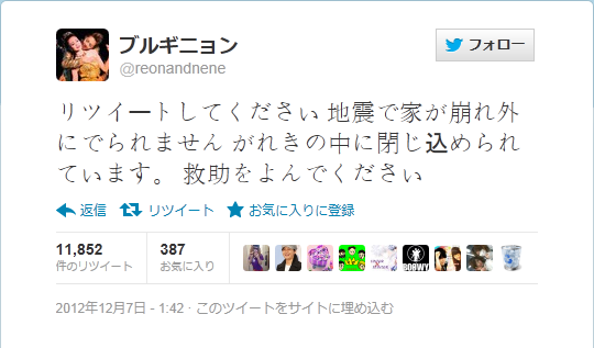 2012年12月7日に発生した東北地震の際に、「がれきの中に閉じ込められた」などと