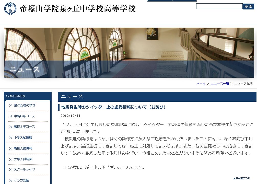 「ツイッター上で虚偽の情報を流した者が本校生徒であることが判明いたしました。