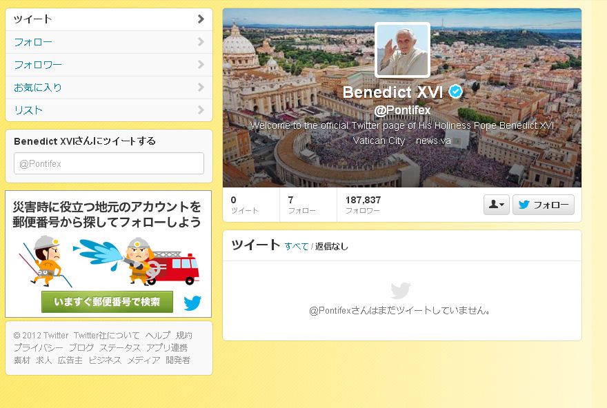 ペンネームにあたるアカウント名は英語用が「@Pontifex」。